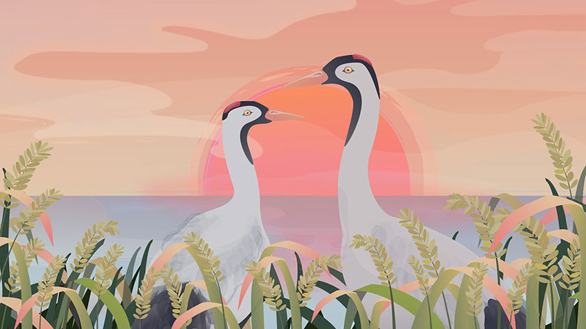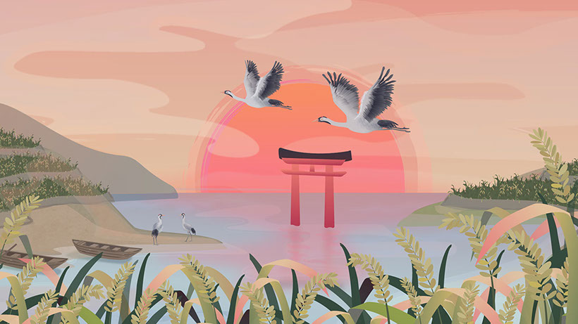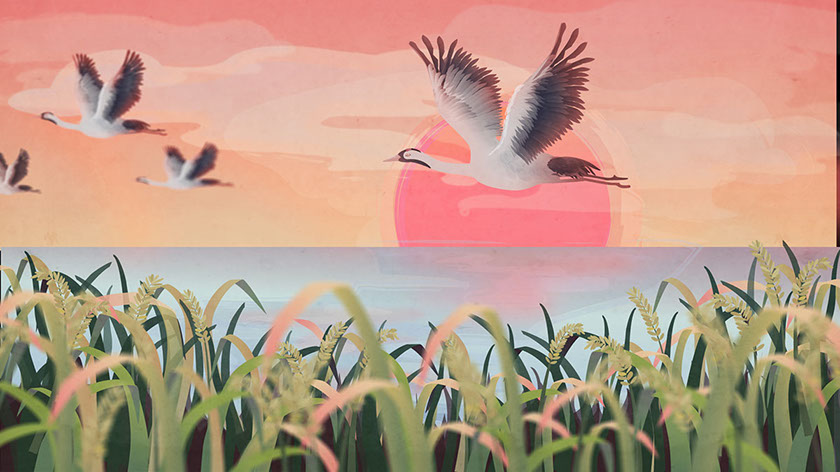 Cranes are a Symbol of Luck. Here they return to a Riceterrace- Tanada- near Hamanoura. Rice terraces have become rare in Japan, as farming is very time consuming. The return of the cranes in this picture should be a sign of hope, that some of these beautiful fields can be preserved as a national treasure.